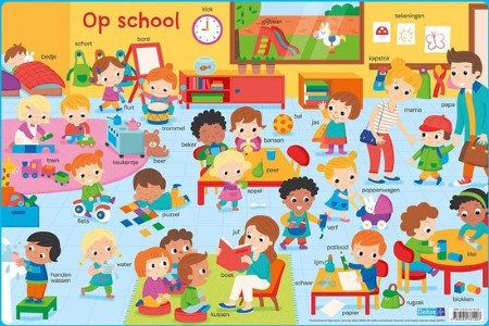 - Op deze onderlegger met een vrolijke en kleurrijke illustratie vind je allemaal dingen die te maken hebben met de school: de juf leest een ...