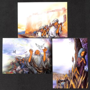 - Pakje met 15 gesorteerde prentbrief- of beloningskaarten met afbeeldingen uit de Kinderbijbel van Liesbeth van Binsbergen. De warme, sfeervolle afbeeldingen zijn gemaakt door Marjolein Hund. Formaat: 103 x 147 mm. Afbeeldingen: * Noach verlaat de ark * Abram verlaat zijn land * ... Meer